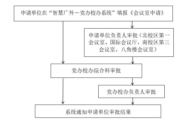 3.申请北校区第一会议室、北校区国际会议厅、南校区第三会议室、南校区八角楼会议厅,在“智慧广外-党办校办系统”的申请需经党办、校办负责人批准后方可使用。