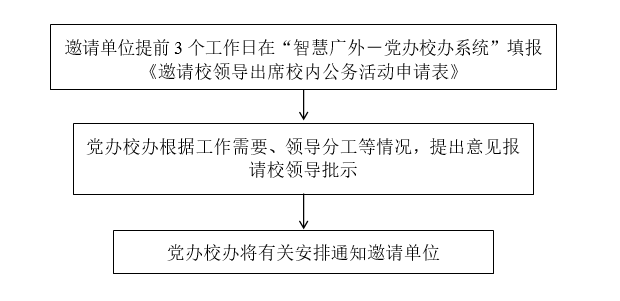 1.各单位需要邀请分管(联系)本单位的校领导出席的,由各单位自行邀请;邀请学校主要领导或非分管(联系)校领导出席的,各单位应提前与党办、校办联系,由党办、校办视情况协调安排。