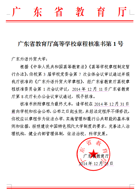 根据《广东省教育厅高等学校章程核准书第1号》,《广东外语外贸大学章程》已于2014年12月23日经广东省教育厅核准,现予公布,自公布之日起实施。